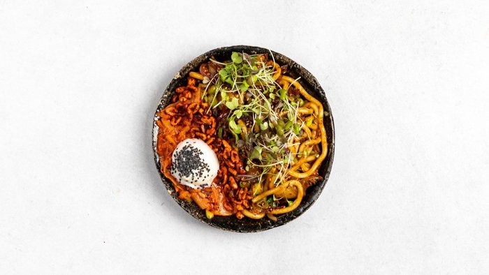 Wołowina bulgogi, sos spice yakiniku, onsen tamago, makaron udon, kimchi, prażone orzeszki gochugaru, sezam, dymka, cebula czerwona, czosnek, edamame